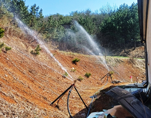 간이수막 설비는 강한 수압으로 물을 분사해 주변에 수막을 형성함으로써 산불 예방에 도움을 주는 시설이다.