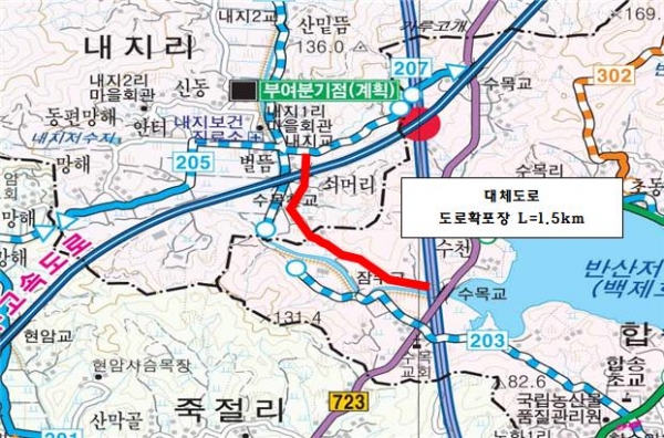 박정현 군수는 “대체도로 개설은 마을까지 1.5km로 군비 40억원이 투입될 예정이다 우선 대체도로 개설을 위해 올해 안에 주민들이 주로 이용하는 마을안길을 농어촌도로로 승격시키고 내년에 설계해 대체도로를 안전한 도로로 개설할 예정”이라고 말했다.