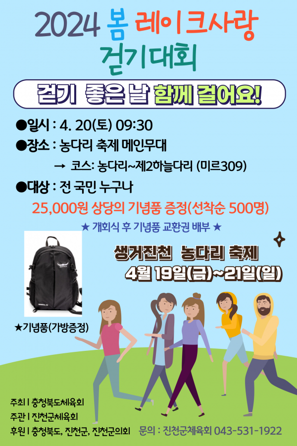 충청북도체육회가 주최하고 진천군체육회가 주관하는 걷기대회는 봄과 가을 두 시즌으로 나눠 충북 도내 11개 시군에서 릴레이로 개최되고 있다.