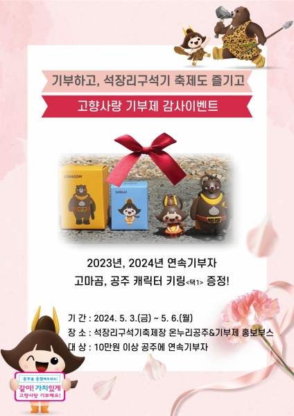 방법은 5월 3일부터 6일까지 석장리박물관 일원에서 개최되는 공주 석장리 구석기축제 기간 중 온누리공주 & 고향사랑기부제 홍보부스를 방문해 고향사랑기부제 공주시 기부명세를 인증하면 된다.