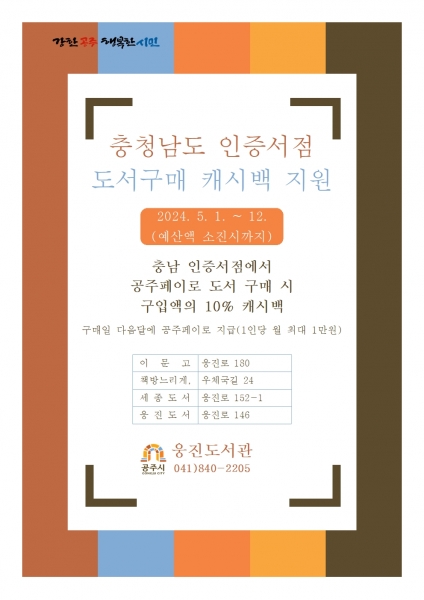 이 사업은 충청남도가 인증한 공주 지역 서점에서 공주페이로 도서를 구입할 경우 구매 누적 결제액의 10%를 구매일 다음 달에 공주페이 캐시백으로 지원하는 내용이다.