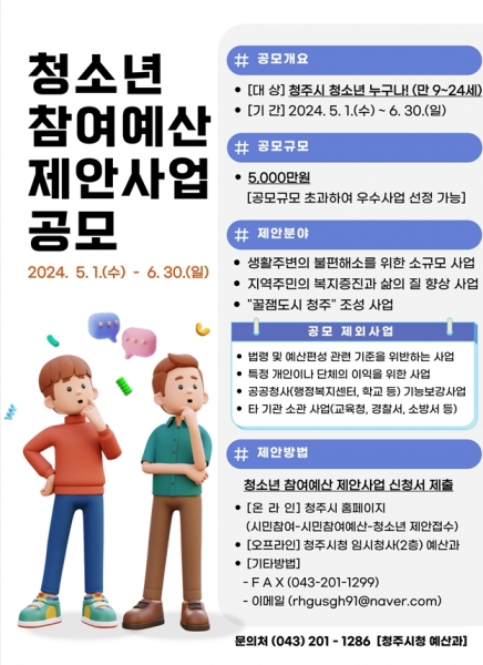 [충청뉴스큐] 청주시는 청소년의 실질적인 정책 참여 기회를 보장하고 청소년이 바라는 지역사회를 실현하고자 ‘청소년 참여예산 제안사업 공모’를 오는 6월 30일까지 진행한다고 밝혔다.