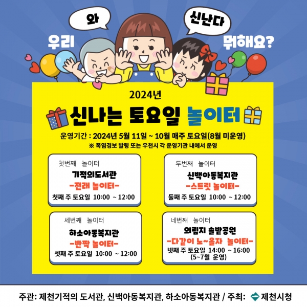[충청뉴스큐] 제천시가 5월 가정의 달을 맞아 오는 둘째 주 토요일인 5월 11일부터 ‘2024년 신나는 토요일 놀이터’를 운영한다.
