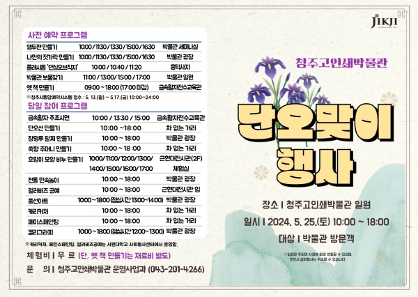[충청뉴스큐] 청주고인쇄박물관은 단오를 맞아 오는 25일 흥덕구 운천동 청주고인쇄박물관 일원에서 다양한 전통문화 행사와 꿀잼 프로그램을 운영한다고 밝혔다.