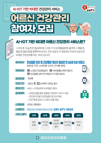 군에 따르면, 태안군보건의료원은 지역 65세 이상 노인을 대상으로 스마트폰 앱을 활용한 비대면 건강관리 서비스인 ‘AI-IOT 기반 어르신 건강관리 사업’을 추진키로 하고 5월 22일부터 선착순 신청·접수를 받는다.