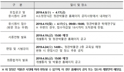 서류 합격자는 19일에 발표하고, 면접 및 시범강의는 4월 24일에 실시할 예정이다. 최종 합격자는 5월부터 2020년 2월까지 근무하며 ‘여름방학 우리 가족 박물관 나들이’ 등 정관박물관 교육프로그램 개발·운영에 참여한다. 기타 자세한 사항은 정관박물관 홈페이지 공지사항을 참고하거나, 학예연구실에 전화로 문의하면 된다.