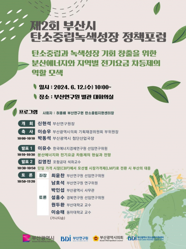 제2회 시 탄소중립녹색성장 정책포럼의 일환으로 시와 시의회, 부산연구원이 공동 주최한다.