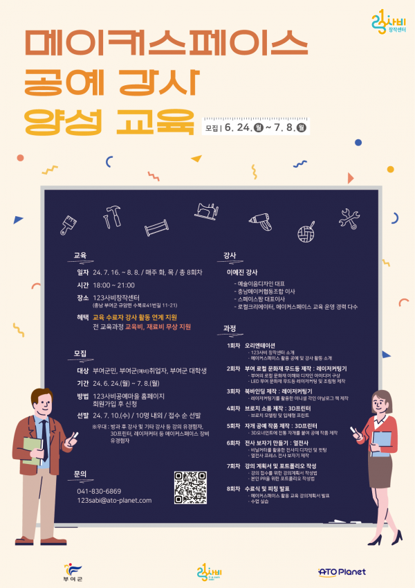[충청뉴스큐] 충남 부여군 123사비 창작센터가 관내 디지털 공예 전문 강사를 양성하고 강사 활동을 지원하는 ‘메이커스페이스 활용 공예 강사 양성 과정’ 교육생을 7월 8일까지 모집한다.
