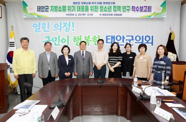 [충청뉴스큐] 태안군의회 의원연구단체 “태안군 지방소멸 위기 대응 정책연구회”는 지난 20일 태안군의회 간담회장에서 태안군의 지방소멸 위기 대응을 위한 청소년 정책 연구용역 착수보고회를 개최했다.