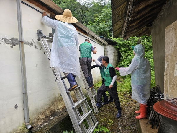 회원 10여명과 행정복지센터 직원 등은 주택 벽면 빗물 누수를 확인하고 방지용 비닐을 설치하고 가재도구 등을 정리했다.