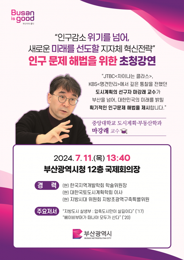 마 교수는 ‘인구감소 위기를 넘어, 새로운 미래를 선도할 지자체 혁신전략’을 주제로 현재 우리 사회가 직면한 인구감소 문제와 이를 극복하기 위한 지자체의 역할에 대해 심도 있는 통찰을 제공할 예정이다.
