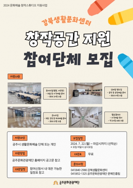 ‘2024 문화예술 창작스튜디오 지원사업’은 공주시에 근거를 두고 문화예술 활동을 하는 성인 단체 또는 개인을 대상으로 강북생활문화센터 동아리실, 온누리실, 신바람밴드실 공간을 지원한다.