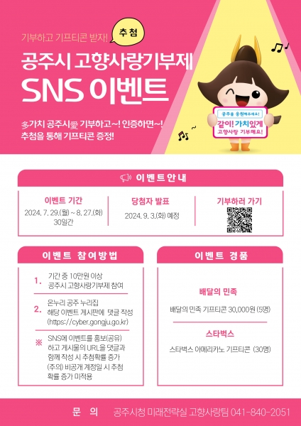 [충청뉴스큐] 공주시는 고향사랑기부제에 대한 인지도를 높이고 기부활성화를 위해 고향사랑기부제 소셜미디어 이벤트를 진행한다고 1일 밝혔다.