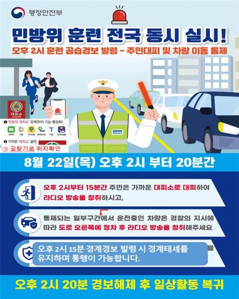 훈련은 20분간 진행되며 오후 2시15분부터 2시20분까지 5분 동안 경계경보가 울리면 경보가 해제돼 일상으로 복귀하면 된다.