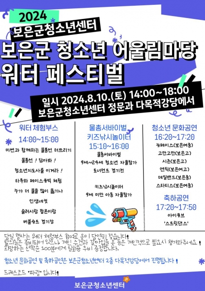 [충청뉴스큐] 보은군청소년센터는 보은군 청소년들의 알차고 행복한 여름나기를 위해 오는 10일 청소년들을 대상으로‘보은군 청소년 어울림마당 워터 페스티벌’을 개최한다.