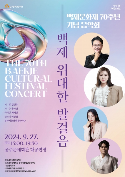백제문화제 70주년 기념 음악회‘백제, 위대한 발걸음’ 공연은 공주문예회관에서 9월 27일 1회차 오후 3시, 2회차 19:30 공연한다.