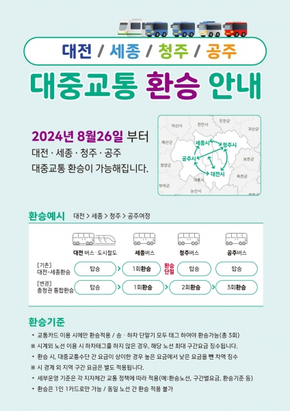 이에 따라 공주에서 대전이나 세종, 청주로 이동할 때 교통비를 추가로 부담하지 않고 간선급행버스체계나 시내버스, 도시철도 등을 무료로 환승할 수 있게 된다.