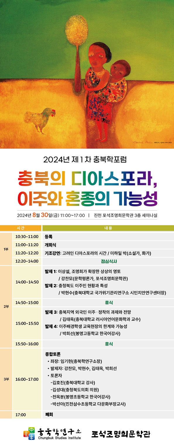 [충청뉴스큐] 진천군은 오는 30일 오전 11시 진천 포석조명희문학관에서 2024년 제1차 충북학포럼 ‘충북의 디아스포라, 이주와 혼종의 가능성’ 포럼을 충북학연구소와 포석조명희문학관이 공동 개최한다고 28일 밝혔다.
