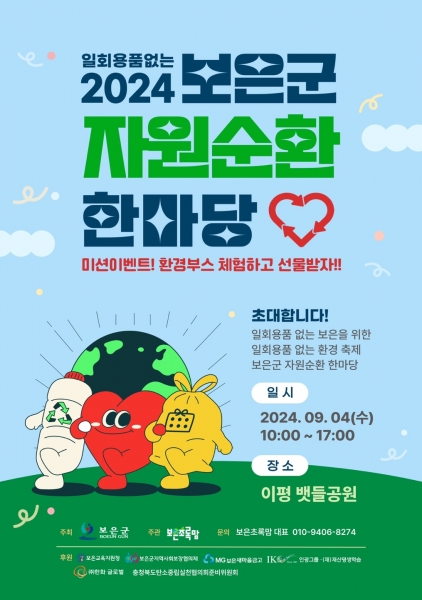 [충청뉴스큐] 보은군은 오는 4일 자원순환을 통해 탄소중립을 실현하고자 ‘2024년 보은군 자원순환 한마당’을 뱃들공원에서 개최한다.