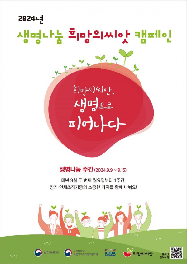 [충청뉴스큐] 올해 처음 시작하는 ‘생명나눔 희망의씨앗 캠페인’은 생명나눔 주간동안 희망의씨앗을 활용해 장기·인체조직 기증에 대해 알리고 기증희망 등록에 동참하게 하는 전국 합동 캠페인이다.