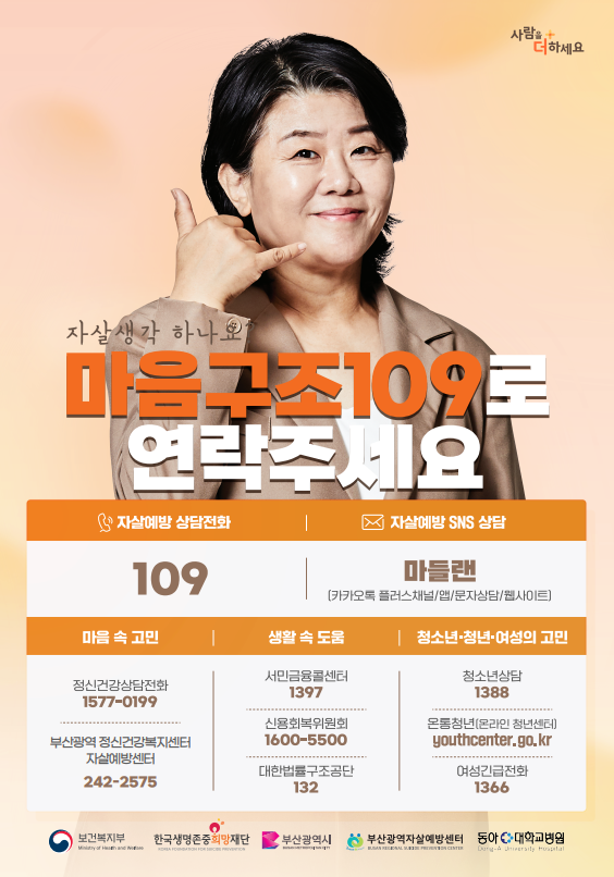 올해 자살예방 실천 메시지는 '자살생각하나요? 마음구조 109'이다.