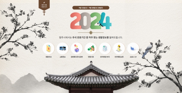 [충청뉴스큐] 청주시는 추석 명절 기간 시민들에게 신속하고 편리하게 정보를 제공하기 위해 시민들이 자주 찾는 정보를 시 홈페이지 한 곳에서 볼 수 있도록 ‘평안한 명절 보내기’ 서비스를 운영한다고 9일 밝혔다.