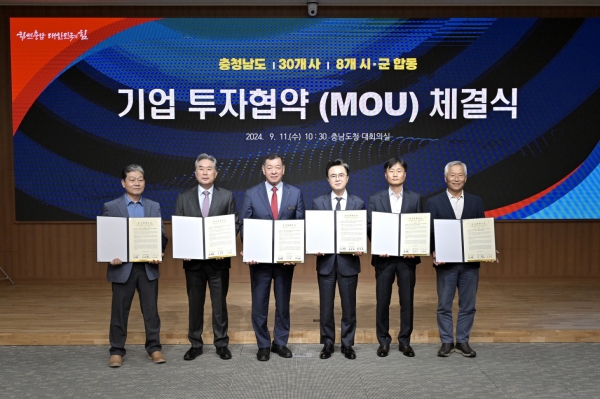 공주시는 11일 충남도청 대회의실에서 김태흠 도지사와 최원철 시장 등이 참석한 가운데 공주, 천안, 아산 등 8개 지자체와 30개 기업이 합동 투자협약을 체결했다.