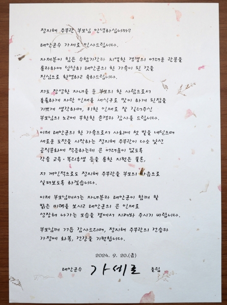 [충청뉴스큐] 지난 20일 총 57명의 신규 공직자를 임용한 태안군이 신규직원의 가정에 감사 서한문을 보냈다고 25일 밝혔다.