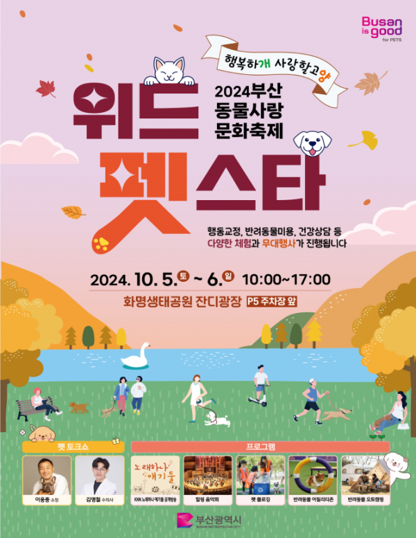 [충청뉴스큐] 부산시는 10월 5일부터 6일까지 이틀간 화명생태공원 잔디광장에서 부산 동물사랑 문화축제 ‘2024 위드펫스타’를 개최한다고 밝혔다.