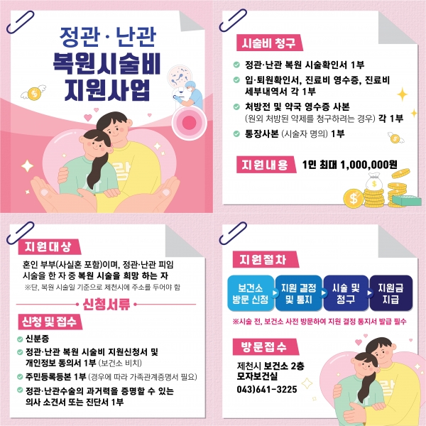 지원대상은 혼인 부부이며 정관·난관 복원 시술일 기준으로 제천시에 주소를 둔 시민이면 신청이 가능하다.
