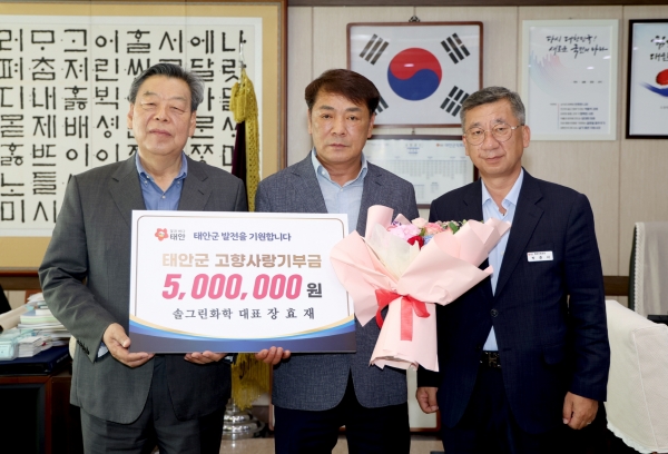 군에 따르면, 태안군 소원면 출신인 장효재 대표는 지난 16일 군청 군수실에서 가세로 군수 등이 참석한 가운데 기탁식을 갖고 태안군에 고향사랑기부금 연간 한도액인 500만원을 전달했다.