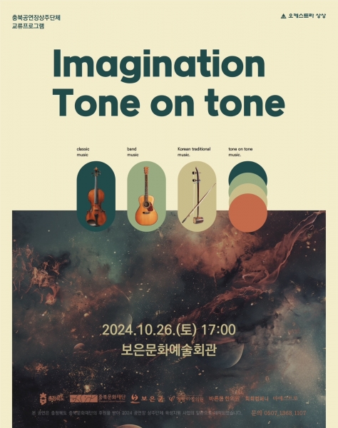 ‘충북 공연장 상주단체 육성 지원사업’의 일환으로 기획된 Imagination: Tone on Tone은 2011년부터 이어온 오케스트라 상상의 크로스오버 콘서트 시리즈로 이번 콘서트에서는 국악과 양악, 그리고 밴드가 결합된 퓨전국악밴드를 중심으로 독창적인 음악을 선보일 예정이다.