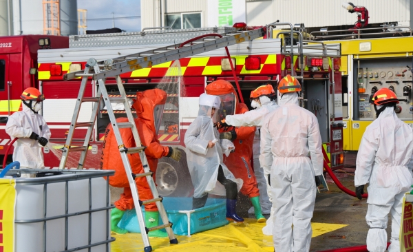 올해는 태안농공단지 내 공장에서 대형 화재가 발생해 유해화학물질이 누출되고 사망자 등 인명피해가 발생했다는 가상 상황에 맞춰 재난 수습 및 대응 훈련이 진행됐으며 산불지휘차와 청소차, 집게차, 굴삭기 등 총 32대의 장비가 동원돼 실전을 방불케 하는 훈련이 치러졌다.