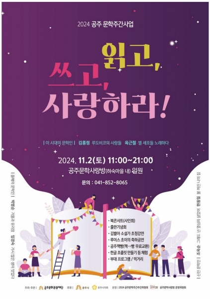 공주문화관광재단이 주최·주관하고‘2024 공주문학주간추진위원회’ 와 ‘공주문학사랑방 운영위원회’ 가 공동 운영하는 이번 문학주간은 ‘읽고 쓰고 사랑하라’라는 주제로 열린다.