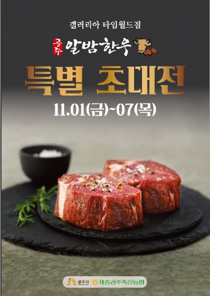 [충청뉴스큐] 공주시는 오는 11월 1일부터 7일까지 일주일간 갤러리아 타임월드점 한우 먹는 날 기념 공주알밤한우 특별 초대전을 개최한다.