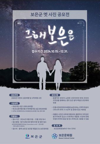 ‘그 해 보은은’ 이라는 주제로 12월 31일까지 진행되는 이번 공모전은 전국에서 누구나 참여할 수 있으며 개인이 소장하고 있는 2000년 이전에 촬영된 보은 지역의 신혼여행 및 수학여행 원본사진을 대상으로 한다.
