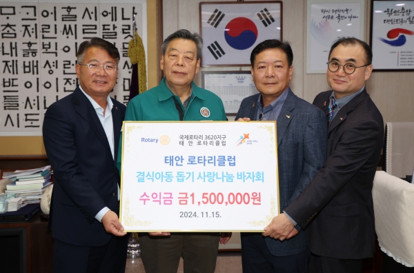 내종선 회장은 “지난 11월 2일 태안군 거리축제에서 결식아동돕기 사랑나눔 바자회를 마련해 발생한 수익금을 어려운 이웃과 나누기 위해 기탁식을 갖게 됐다”며 “앞으로도 태안군의 발전에 힘쓰는 로타리클럽이 될 수 있도록 노력하겠다”고 말했다.
