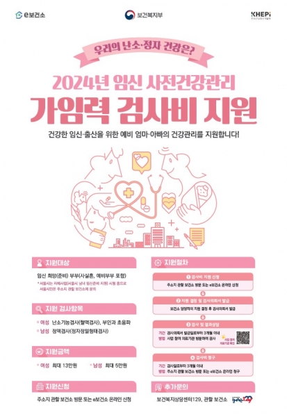 이 사업은 난임 및 고위험 임신, 미숙아 출산 증가 등 사회 현상을 고려해 임신 및 출산에 영향을 줄 수 있는 건강위험 요인을 조기에 발견하기 위해 검진비를 지원하는 사업으로 여성은 난소기능검사와 부인과 초음파 검사 비용으로 최대 13만원, 남성에게는 정액검사 비용으로 최대 5만원까지 지원된다.