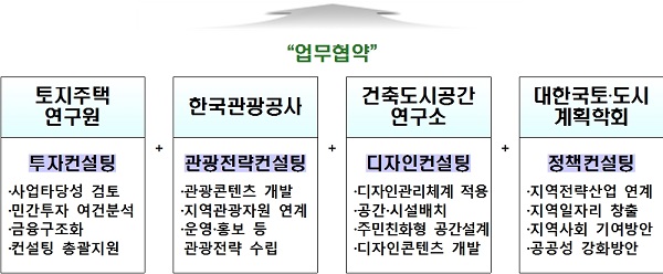 [충청뉴스큐]국토교통부는 고품격 지역개발사업을 통한 지역의 새로운 가치창출을 위해 ‘토지주택연구원 - 한국관광공사 - 건축도시공간연구소 - 대한국토·도시계획학회’ 이상 4개 기관이 공동으로 26일 ‘지역주도형 발전 모델 구축을 위한 지역 혁신 컨설팅 업무협약’을 체결했다고 밝혔다.