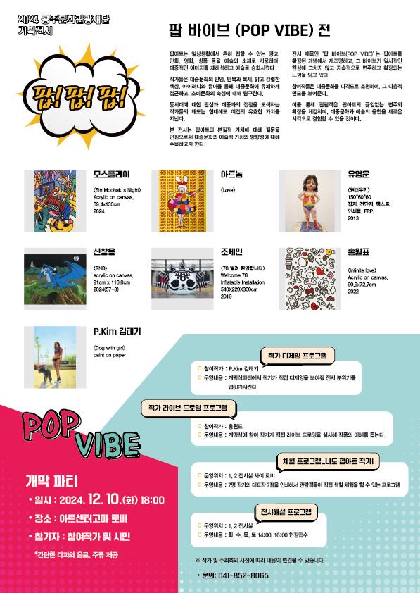 [충청뉴스큐] 공주문화관광재단은 시민들에게 수준 높고 새로운 전시를 제공하기 위해 2024 기획전으로‘팝 바이브’를 오는 12월 10일부터 명년 1월 19일까지 아트센터고마에서 개최한다.