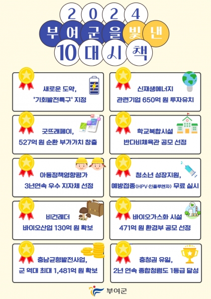 [충청뉴스큐] 부여군은 지난 5일 2024년 군정의 주요 성과를 담은 ‘2024년 부여군을 빛낸 10대 시책’을 선정·발표했다.