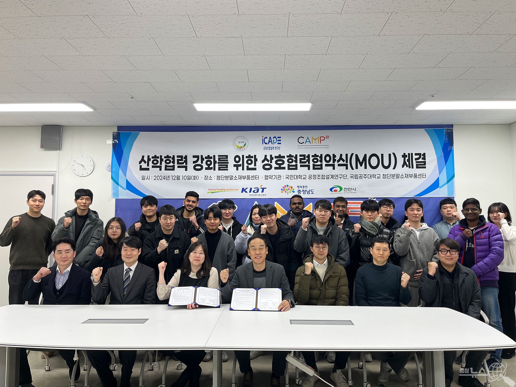 이날,협약식은 국립공주대 첨단분말소재부품센터 홍순직 센터장, 송기안 교수, 이지운 교수 문종언 교수와 국민대 신소재공학부 학부장 최현주 교수, 설재복 교수, 성효경 교수 등 주요 관계자들이 참석한 가운데 진행됐다.