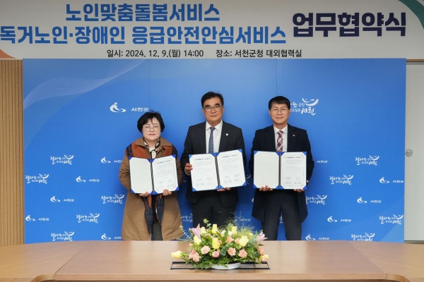 [충청뉴스큐] 서천군은 지난 9일 노인맞춤돌봄서비스와 독거노인·장애인 응급안전안심서비스의 원활한 추진을 위해 서천노인복지센터, 서천노인복지관과 업무협약을 체결했다.