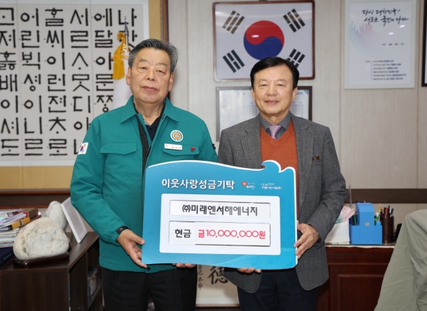 군에 따르면, ㈜미래엔서해에너지는 지난 16일 군청 군수실에서 박영수 대표이사와 가세로 군수 등이 참석한 가운데 기탁식을 갖고 어려운 이웃을 위해 써달라며 성금 1천만원을 군에 전달했다.