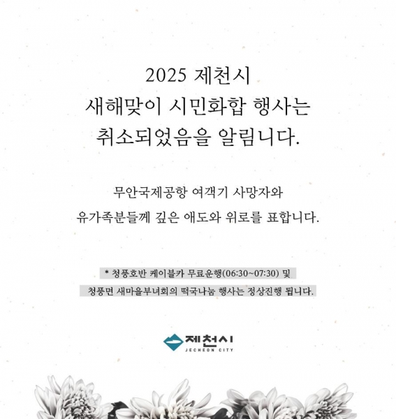 [충청뉴스큐] 제천시는 오는 1월 1일 청풍면 비봉산 정상에서 열릴 예정이던 신년 해맞이 시민화합 행사를 전격 취소했다.
