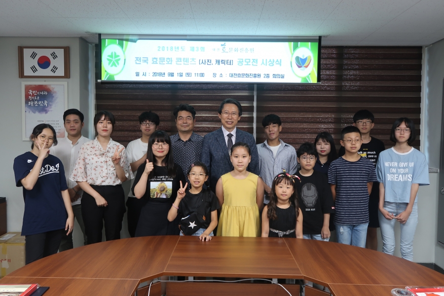 대전효문화진흥원(원장 장시성)은 지난 1일 11시 회의실에서 2018년도 제3회 전국 효문화 콘텐츠(만화, 캐릭터) 공모전 시상식을 개최하였다. 이 공모전은 전국민이 효에 대한 공감대를 형성하고 부모님과 효에 대해서 다시 한번 생각해보는 계기를 마련하기 위해 개최되었으며, 효문화 진흥에 대한 지속적인 관심과 참여를 촉구하고자 시상식 자리가 마련되었다. 공모전에 응모된 작품 총 102건 중 35점이 수상작품으로 선정되었다. 대상(대전광역시장상)은 박광열(생) 등 2명, 최우수상(대전광역시교육감상)은 정세린 (금강산 지게효자) 등 4명, 우수상(이하 대전효문화진흥원장상), 장려상 및 특별상은 김다윤(호랑이 형님) 등 29명이 수상의 영예를 안았다. 수상작은 현재 대전효문화진흥원 지하 1층 로비에서 전시 중이다. 대전효문화진흥원은 앞으로도 분기별 공모전을 실시하여 효문화 확산의 기회를 마련하고 효문화 진흥에 대한 지속적인 관심과 참여를 유도할 예정이다.
