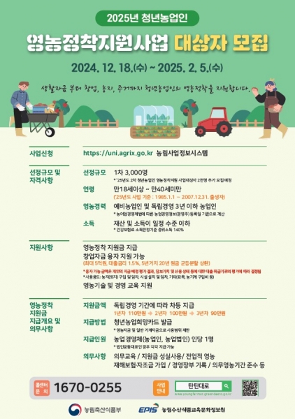 청년농업인 영농정착 지원 사업 참여를 희망하는 청년은 2월 5일까지 농림사업정보시스템에 접속해 온라인으로 신청하면 된다.