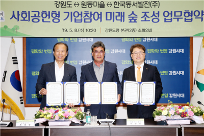 [충청뉴스큐] 강원도는 8일 강원도청 본관 2층 소회의실에서 한국동서발전, 태백시 원동마을과 함께 '기업참여 미래 숲 조성사업' 추진을 위한 업무협약을 체결했다고 밝혔다.