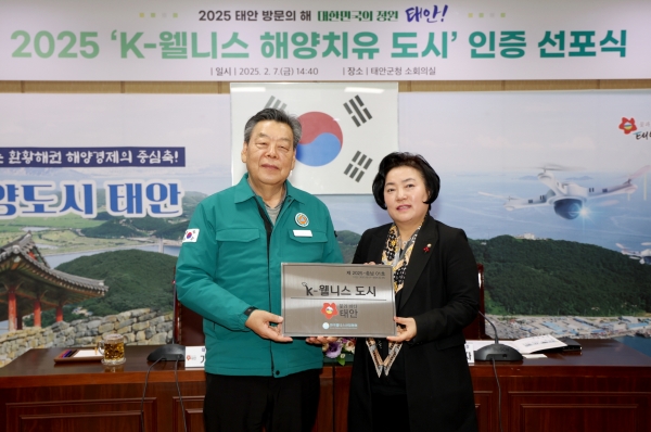 군은 지난달 ‘2025년 K-웰니스 도시’ 발표 결과 태안군이 해양치유 부문 K-웰니스 도시로 선정됨에 따라 7일 군청 소회의실에서 가세로 군수와 한국웰니스산업협회 김미자 회장 등이 참석한 가운데 ‘K-웰니스 해양치유 도시 선포식’을 가졌다고 밝혔다.