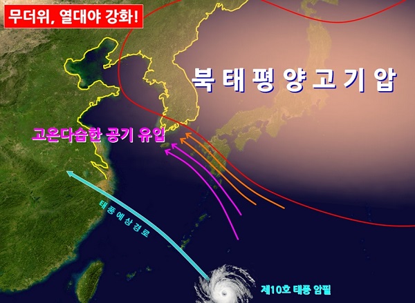 당분간 기압계의 큰 변화는 없을 것으로 보이며 ① 기온 상승 경향 유지, ② 대기 하층의 수증기와 열 축적, ③ 안정한 기단 내에서 비가 내리기 어려운 조건이 지속됨에 따라 고온현상은 7월 말까지도 이어질 것으로 예상되고, 특히 이번 주말 부터는 제10호 태풍 암필 이 대만 북동부 해상을 경유하여 중국 상해부근으로 이동함에 따라, 태풍에 동반된 뜨거운 수증기가 한반도로 유입되면서 무더위로 인한 불쾌지수가 상승하고 습도 증가에 의해 열대야 발생 지역이 확대되어 강화될 것으로 예상된다.